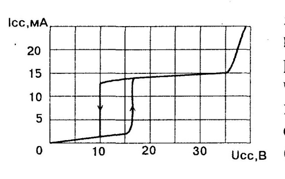 В этом режиме источник питания выключается при уменьшении питающего напряжения в аварийных режимах работы монитора. Типовая зависимость потребляемого тока микросхемы от ее напряжения питания приведена на диаграмме. В режим малого потребления энергии микросхема переводится путем перегрузки по одному из выводов питания (опорному или непосредственно питания).