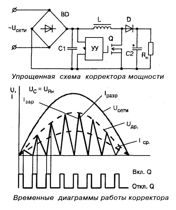Работа выпрямителя на емкостную нагрузку (фильтр, преобразователь) приводит к отставанию тока от напряжения (см. рис.), искажению формы электрического тока (отличию его от синусоидальной), что естественно сопровождается порождением нежелательных паразитных гармоник. Они распространяются по питающим проводам. Величина коэффициента мощности в этой схеме находится в пределах 0,5...0,7. Очевидно, что, обеспечив многократный подзаряд фильтрового конденсатора в течение полуволны выпрямленного напряжения, можно уменьшить величину угла φ (см. рис.), Iзар, Iразр на рисунке — это токи заряда и разряда конденсатора фильтра С, соответственно.