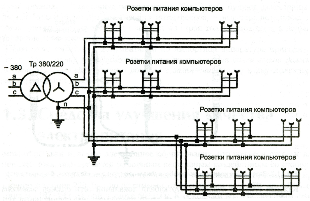 Дополнительные проблемы при разводке электропитания для компьютеров обусловлены ярко выраженной динамической нелинейностью входной цепи бестрансформаторных блоков питания. Традиционные электросети рассчитаны на более или менее линейную нагрузку, у которой в спектре тока основная мощность приходится на 1-ю гармонику. В трехфазной сети с равномерно распределенной по фазам линейной нагрузке в идеале через нейтральный провод ток практически не течет, поскольку токи от нагрузок всех трех фаз компенсируют друг друга. Учитывая это свойство, в большинстве четырехпроводных кабелей сечение проводника для нейтрали существенно меньше, чем сечение фазных проводников. При нелинейной симметричной нагрузке фаз при большом уровне 3-й гармоники тока (что характерно для бестрансформаторных блоков питания) взаимной компенсации токов не происходит, и действующее значение тока в нулевом проводе оказывается даже больше, чем в каждом из фазных. Таким образом, при подключении большого числа компьютеров к традиционной 4-проводной трехфазной проводке происходит перегрузка нулевого провода. Эта перегрузка приводит к следствиям разной степени тяжести — от «набегания» помехи переменного тока на нулевом проводе до перегорания нулевого провода, который никогда не защищают от перегрузки — все автоматы защиты ставятся только в фазных проводах. Во избежание перегрузки нулевого провода и в случае питания от трехфазной сети силовую разводку к розеткам от распределительного щита следует опять-таки вести трехпроводным кабелем. Перегрузки нулевого провода подводящего силового кабеля можно избежать, установив в распределительном щите развязывающий трехфазный трансформатор 380/220 В. К этому трансформатору входное напряжение подводится по схеме «треугольника», а выходные обмотки соединяют по схеме «звезда».